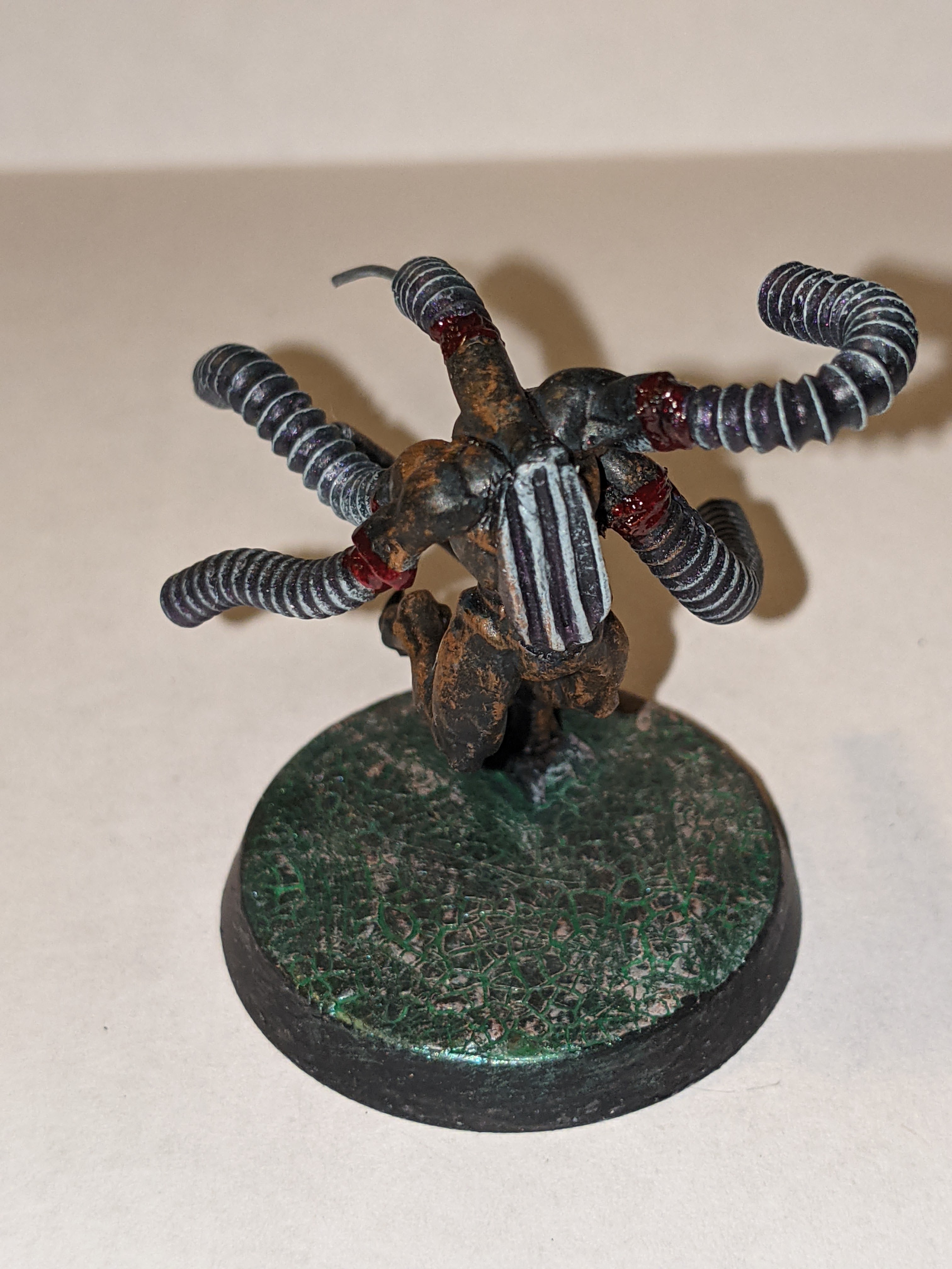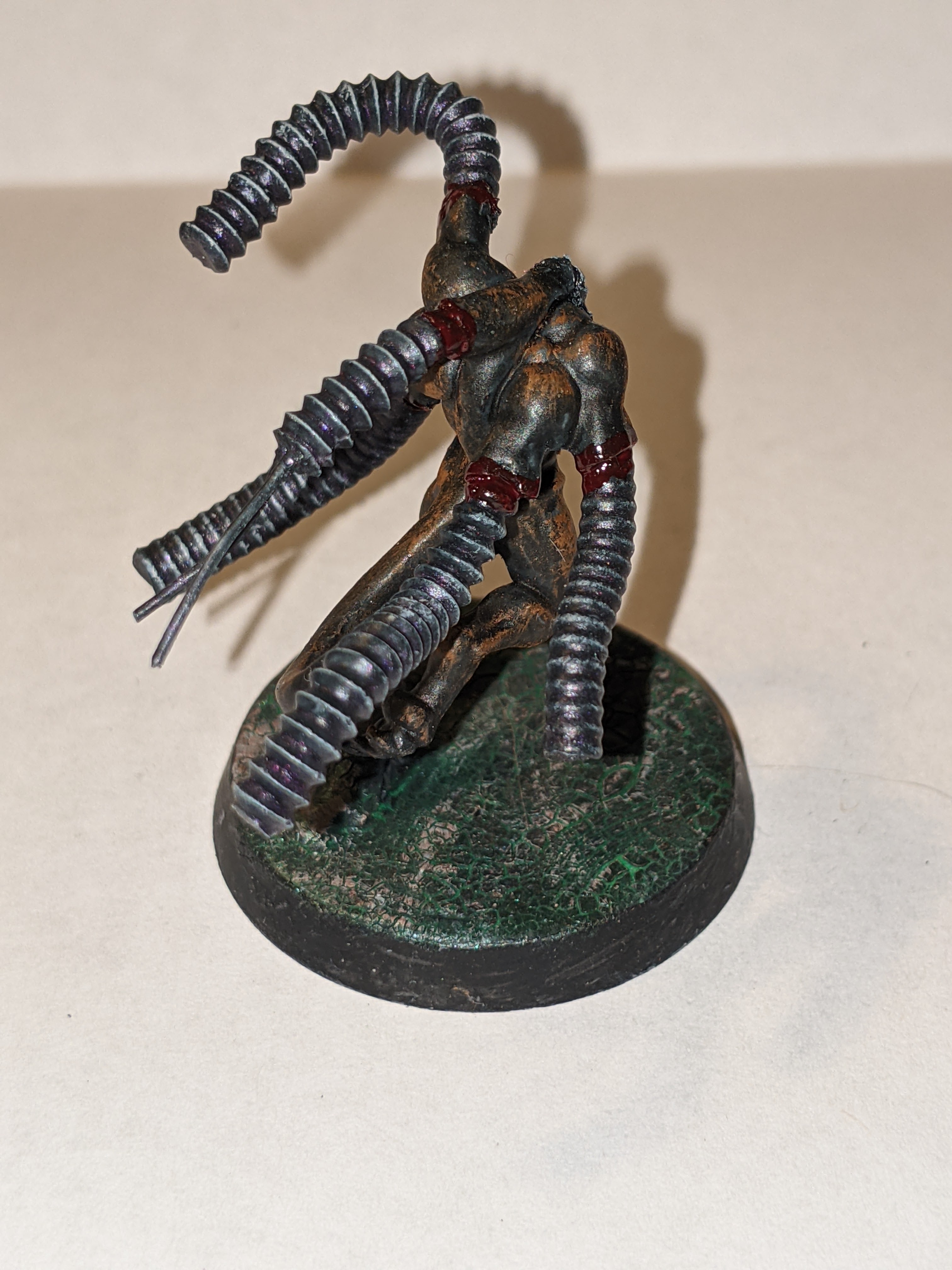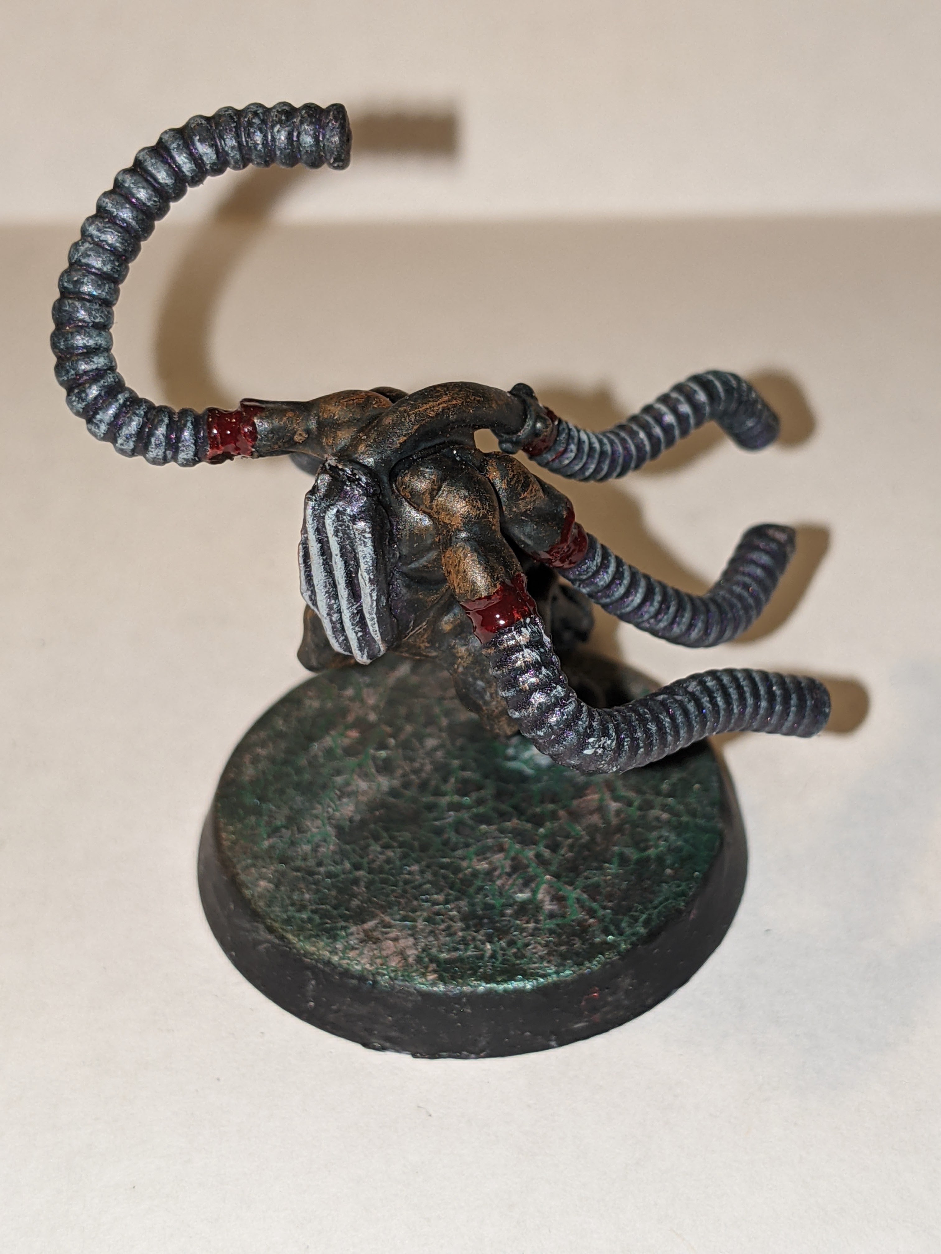 The base was a weird process I refined overtime, but the original concept was to apply Mordant Earth to the base in large quantities and then got over it with Hexwraith Flame, dry brushing with Celestra Gray after that. The end result was pretty cool, but I was doing the process all wrong and I added an extra element later that really made the process amazing. I started with applying the Hexwraith Flame to the base in large quantities, then applied PVA glue in a thin coat on top of that. Once dried, I applied the Mordant Earth, and once it was cracked and dry, a drybrush of Celestra Gray. The final piece at the top was this color from Turbo Dork called “Dark Net”, which is a turboshift acrylic paint. The paint is designed to go over a black base coat and be applied a few times for maximum effect, but my use of it was just to give the base the faintest glimmer of metal in what was otherwise a flowing liquid, the birth of my “Fleshmetal”.