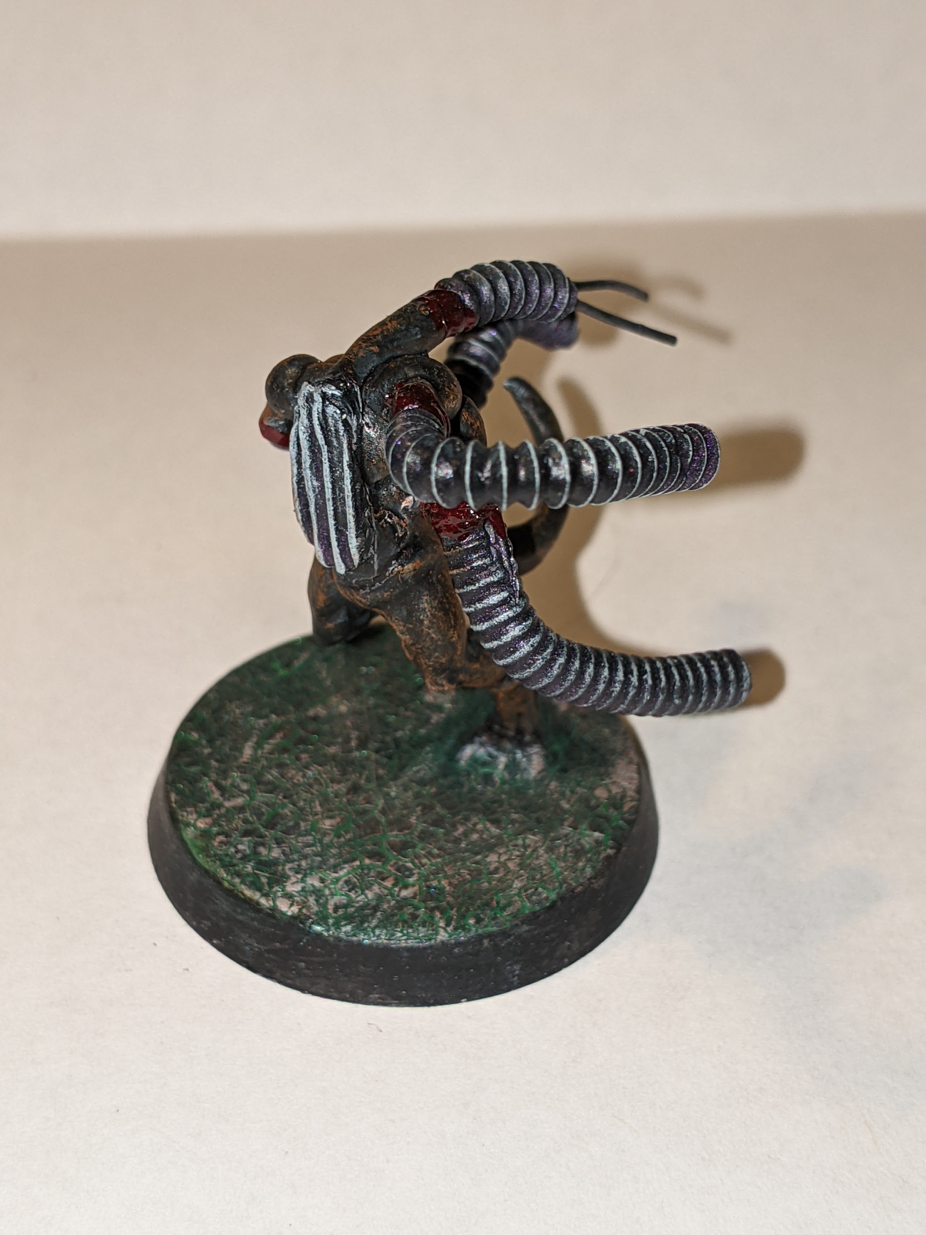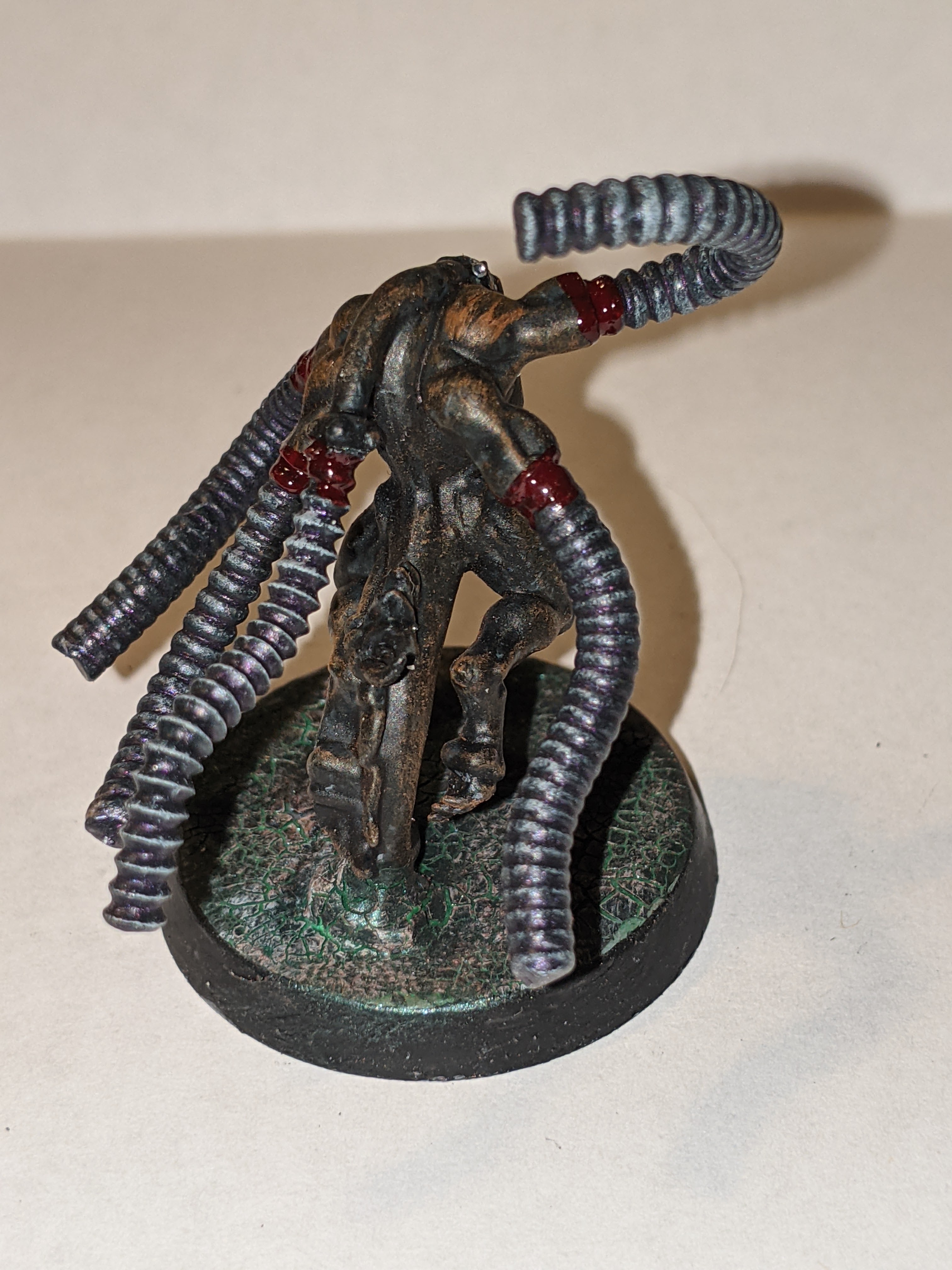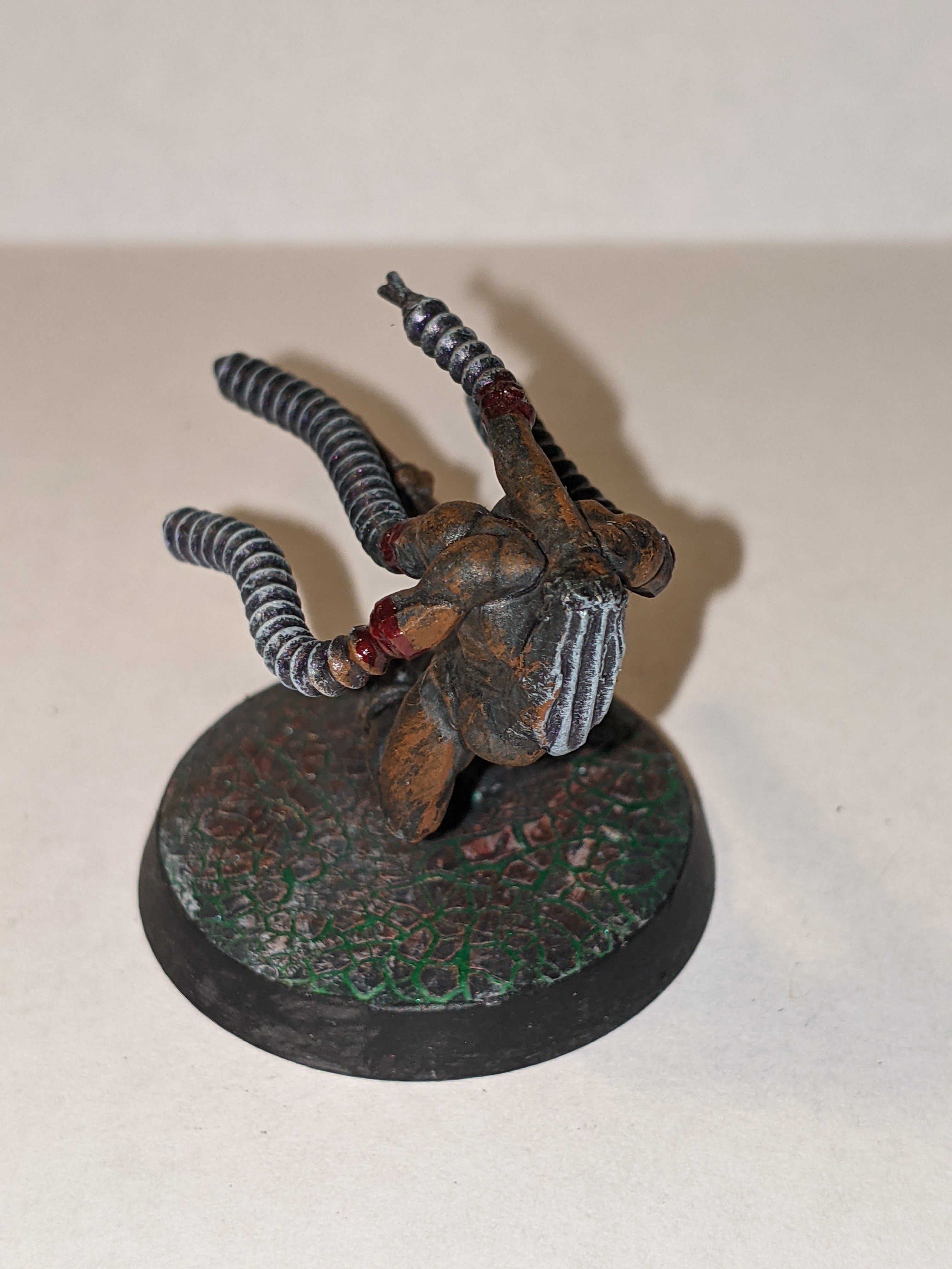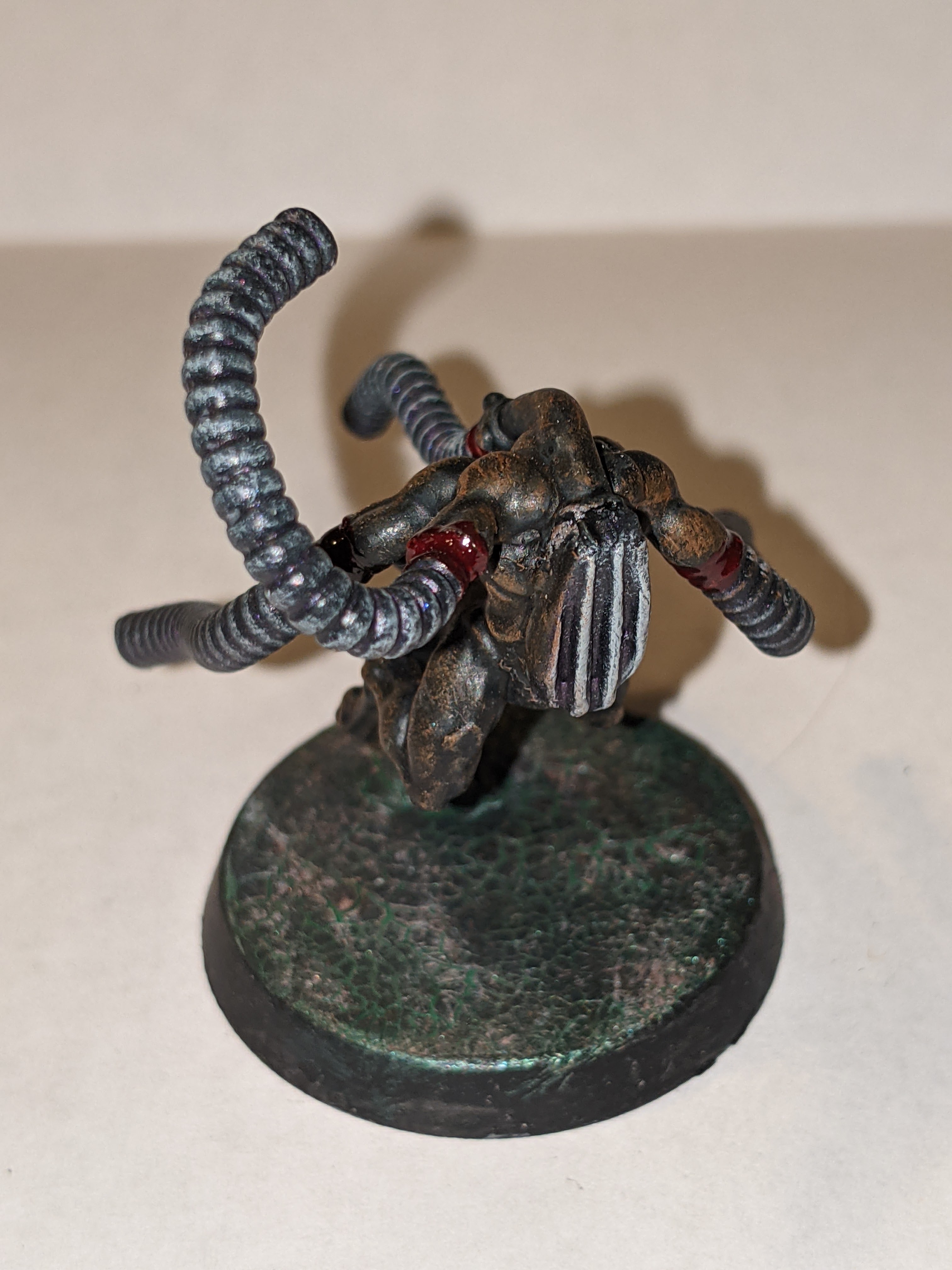 The base was a weird process I refined overtime, but the original concept was to apply Mordant Earth to the base in large quantities and then got over it with Hexwraith Flame, dry brushing with Celestra Gray after that. The end result was pretty cool, but I was doing the process all wrong and I added an extra element later that really made the process amazing. I started with applying the Hexwraith Flame to the base in large quantities, then applied PVA glue in a thin coat on top of that. Once dried, I applied the Mordant Earth, and once it was cracked and dry, a drybrush of Celestra Gray. The final piece at the top was this color from Turbo Dork called “Dark Net”, which is a turboshift acrylic paint. The paint is designed to go over a black base coat and be applied a few times for maximum effect, but my use of it was just to give the base the faintest glimmer of metal in what was otherwise a flowing liquid, the birth of my “Fleshmetal”.