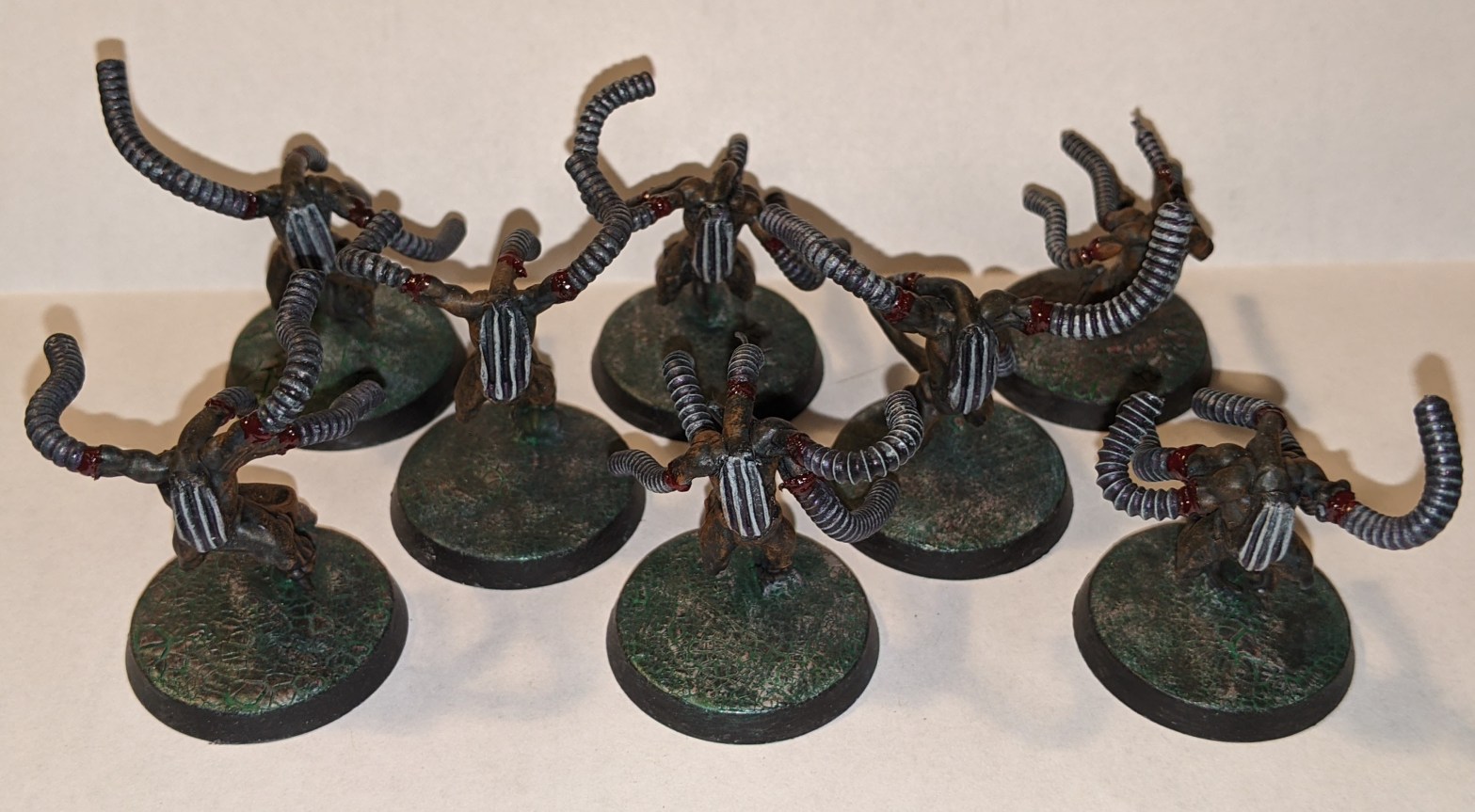At this point I went over the models to remove any extra bits that didn’t fit in and rebased them onto 32mm bases. This was actually one of the harder parts because Pink Horrors have a single attach point to the base and I had to be careful not to break it when removing them from the 25mms. The 32mm bases I used were nothing special, just standard GW 32mm bases.