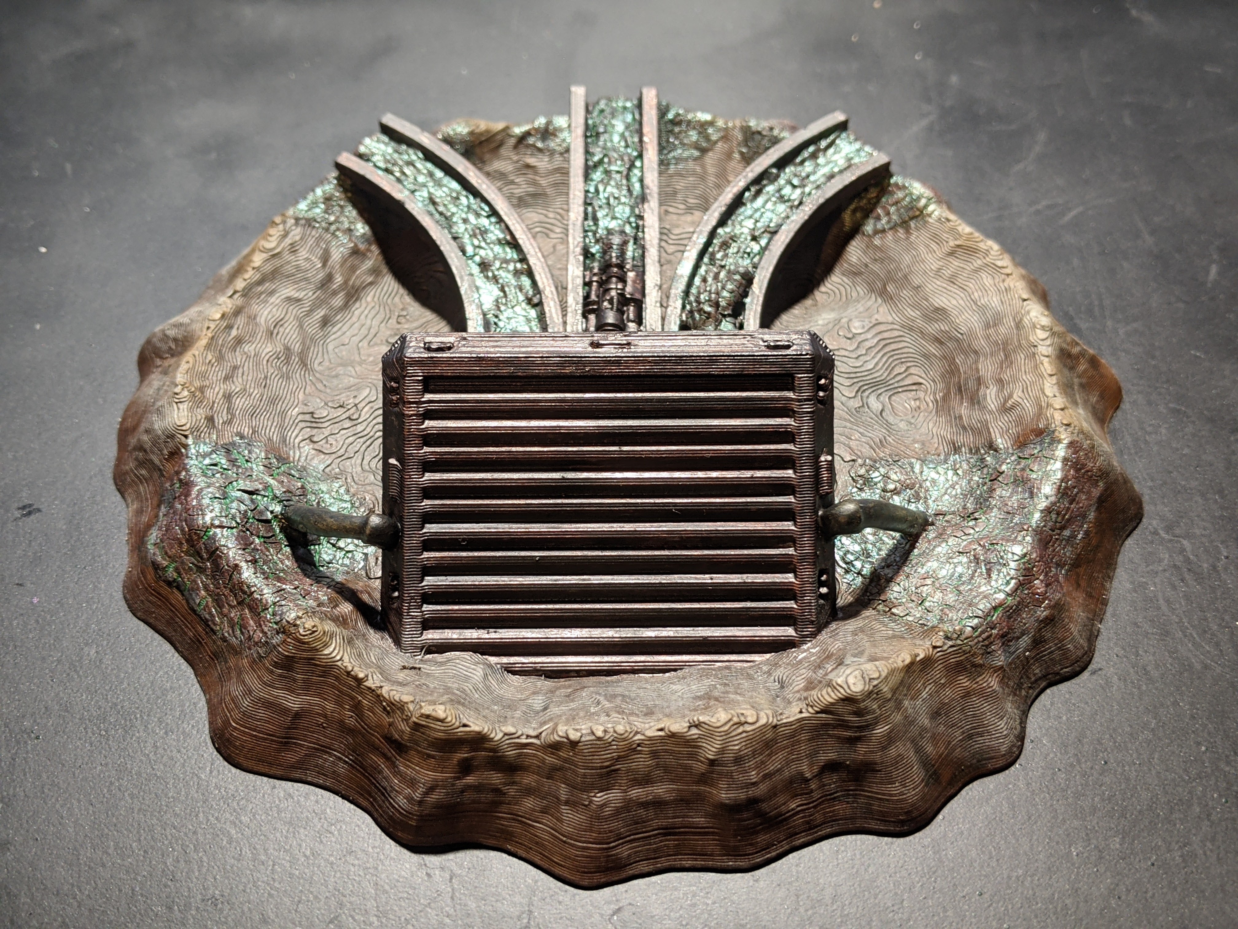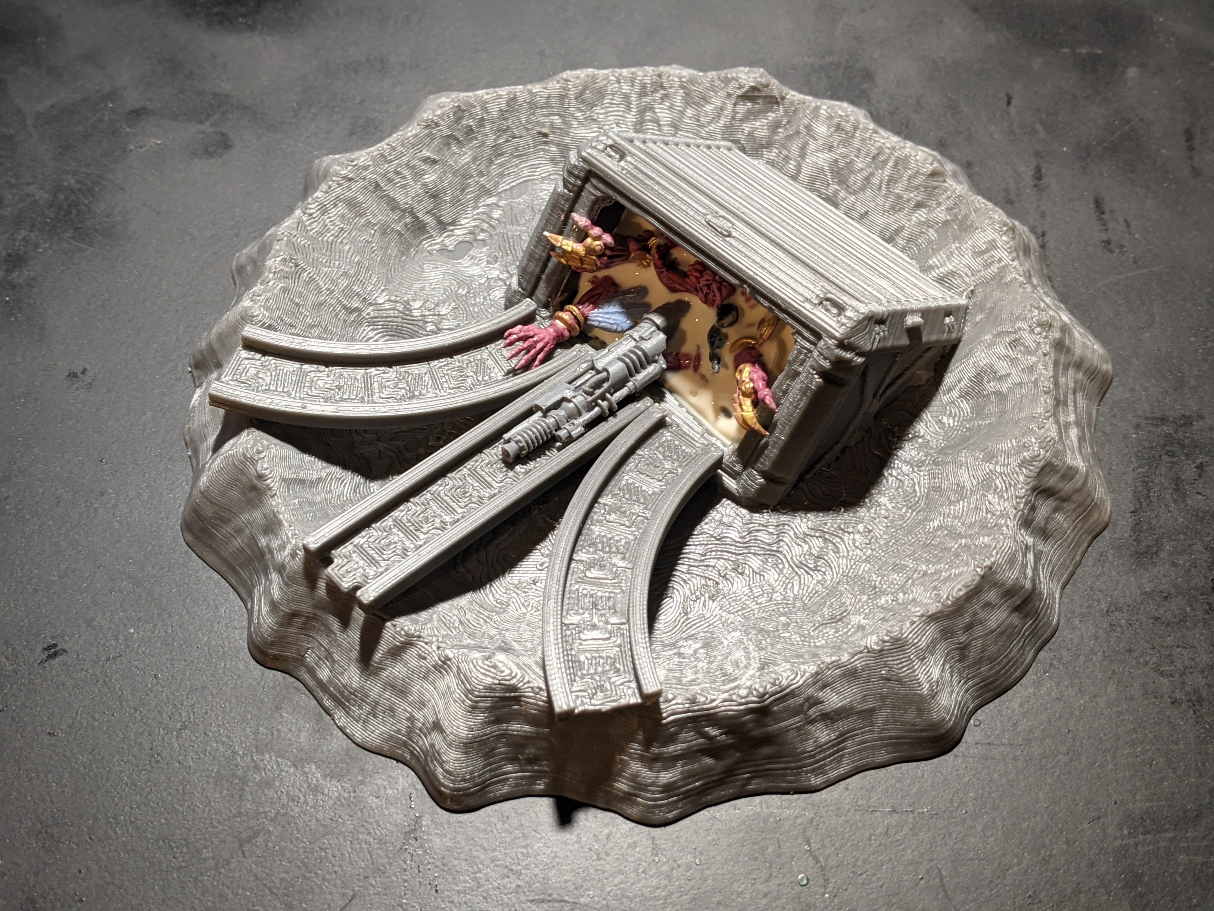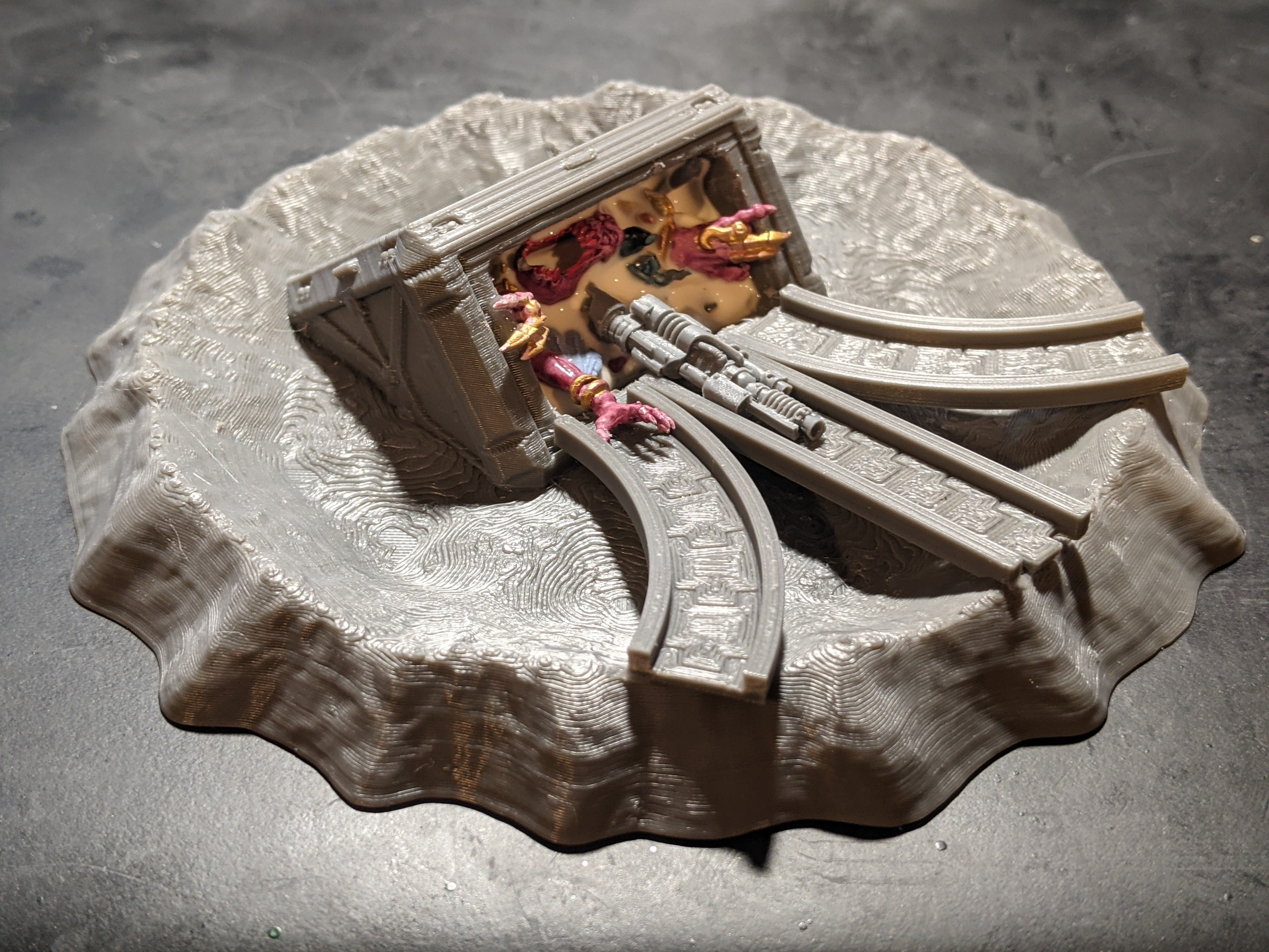I set to work finding a crater and sizing it to exactly 5″. I then found a sufficiently cool crate to embed in the crater for my printing. Next I found a trio of conveyor belts to attach to the front of it. Like most of my projects for this army, I would start with a design concept and then the real fun came to when I put it into motion and starting adding weird details to it. This would be no different.